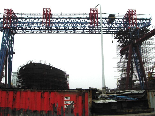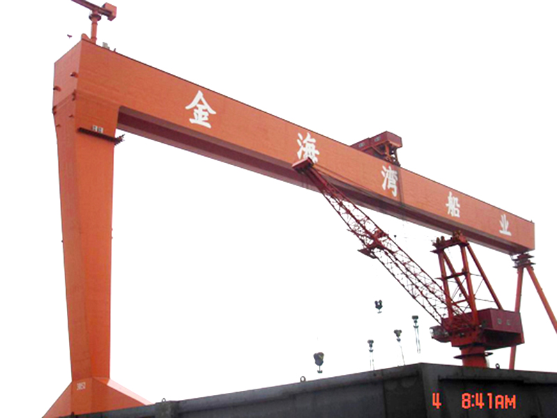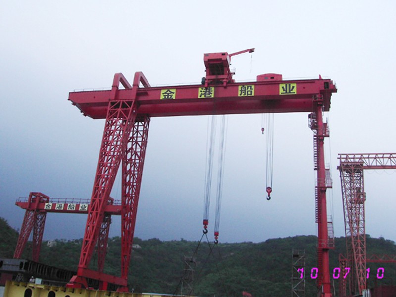 造船门式起重机适用于造船厂制作场所(船坞、船台)进行造船作业,具有单吊、双点抬吊、三点抬吊、空中翻转吊件和轻载(≤50%满载)快速升降、低风速(≤8m/s)快速运行等多种作业功能,在起重机整体吊装